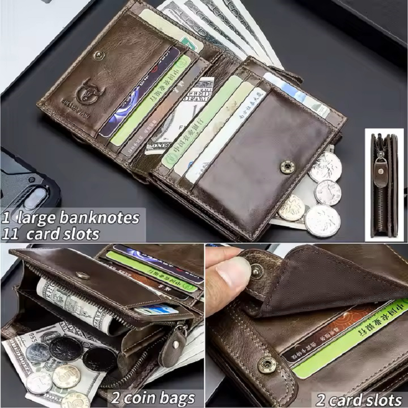 Tiene espacio para 13 tarjetas, tu identificación, billetes extendidos y hasta un amplio monedero con cierre, ideal para quienes usan efectivo o simplemente quieren tenerlo todo bien organizado. La textura del cuero se siente sólida y refinada, mientras que el broche externo y la cremallera lateral aseguran que nada se mueva de su sitio.
