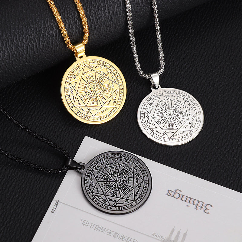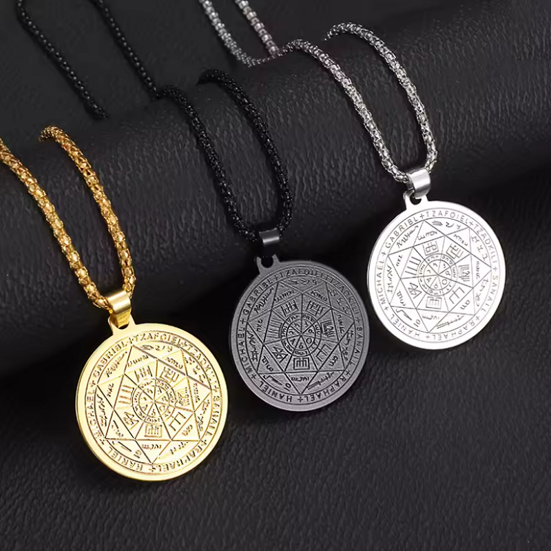 Este imponente collar con cadena de acero inoxidable y dije circular grabado con el Sello de los 7 Arcángeles no es solo un accesorio: es un escudo energético, una declaración de fe, y un emblema de estilo único.